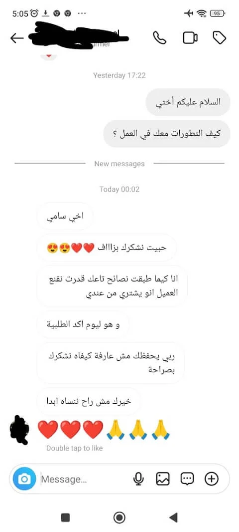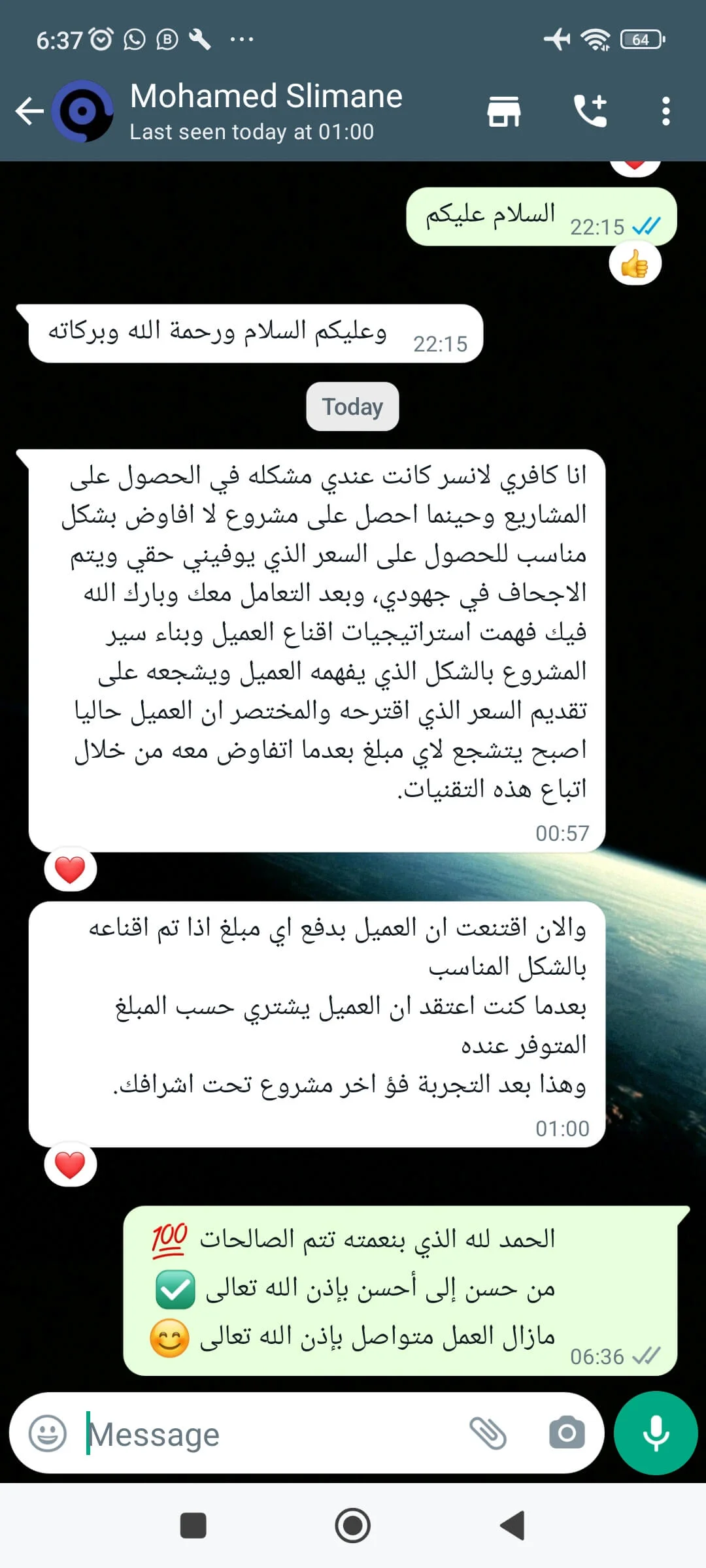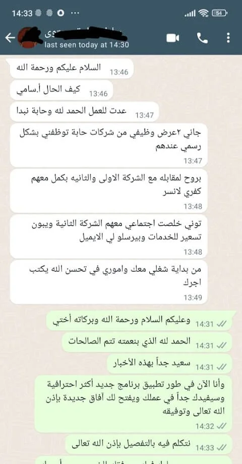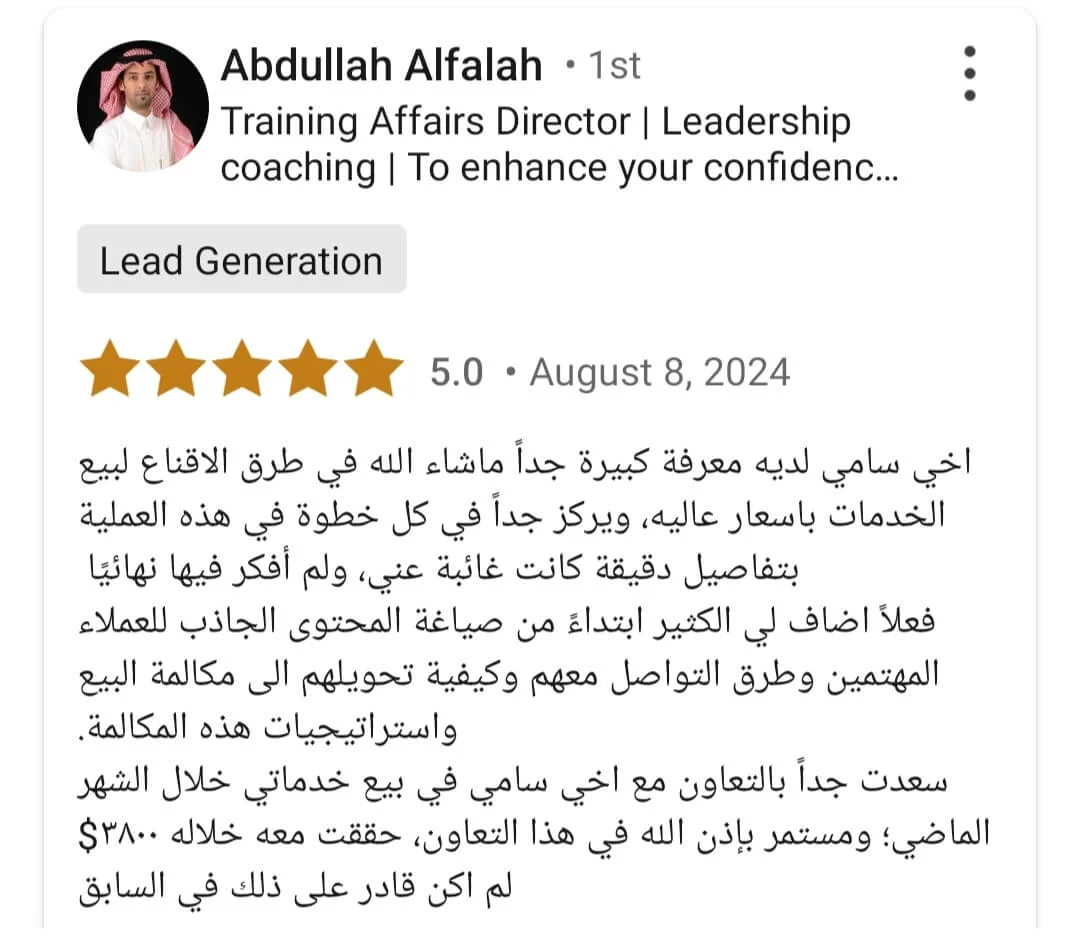 ⭐️ ساعدته من خلال دورة صغيرة ومتابعة في توليد عميل جديد بشكل شبه يومي من خلال التواصل المباشر ونجح في الحصول على أوّل عميل بسعر مناسب خلال 48 ساعة من التطبيق بفضل الله تعالى وتوفيقه